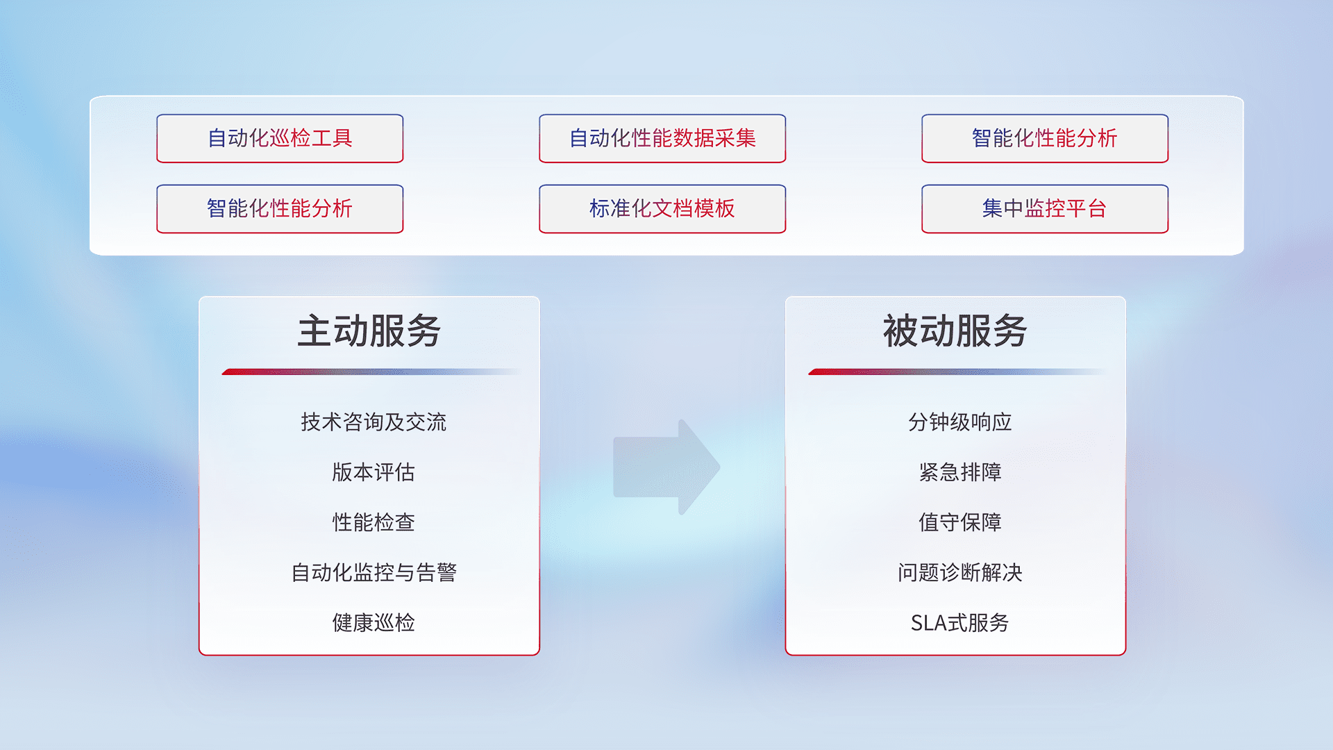 智能化工具和标准化文档,,,,保障服务质量,,,,提供主动服务(包含技术咨询、、、版本评估、、、性能检查、、、自动化监控与告警、、、、健康巡检)和被动服务包含(分钟级响应、、、、紧急排障、、值守保障、、问题诊断解决、、、、SLA服务)。。